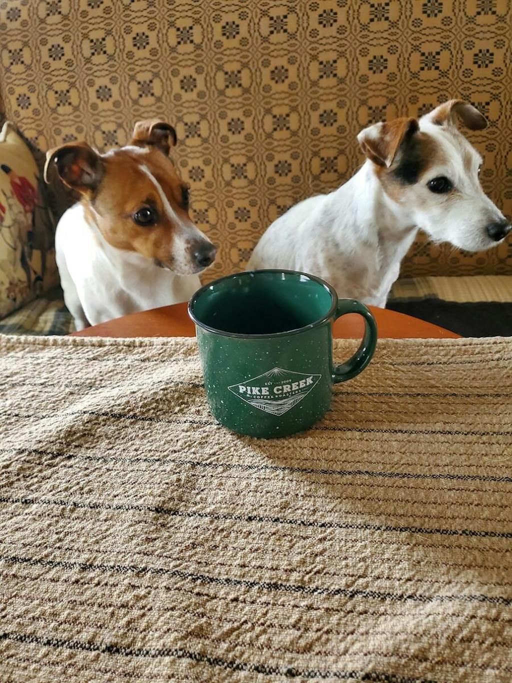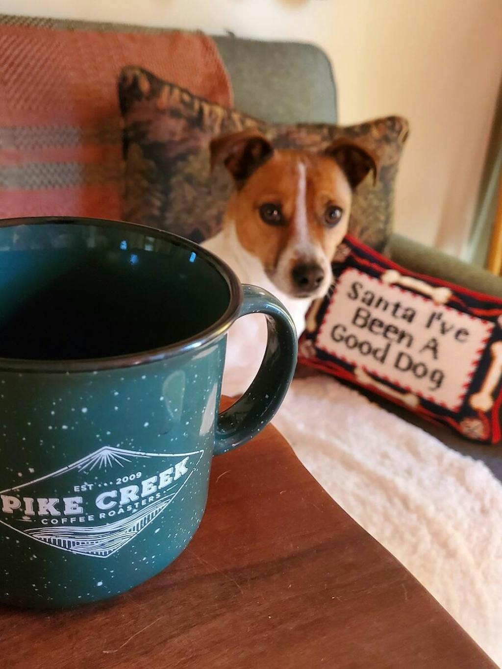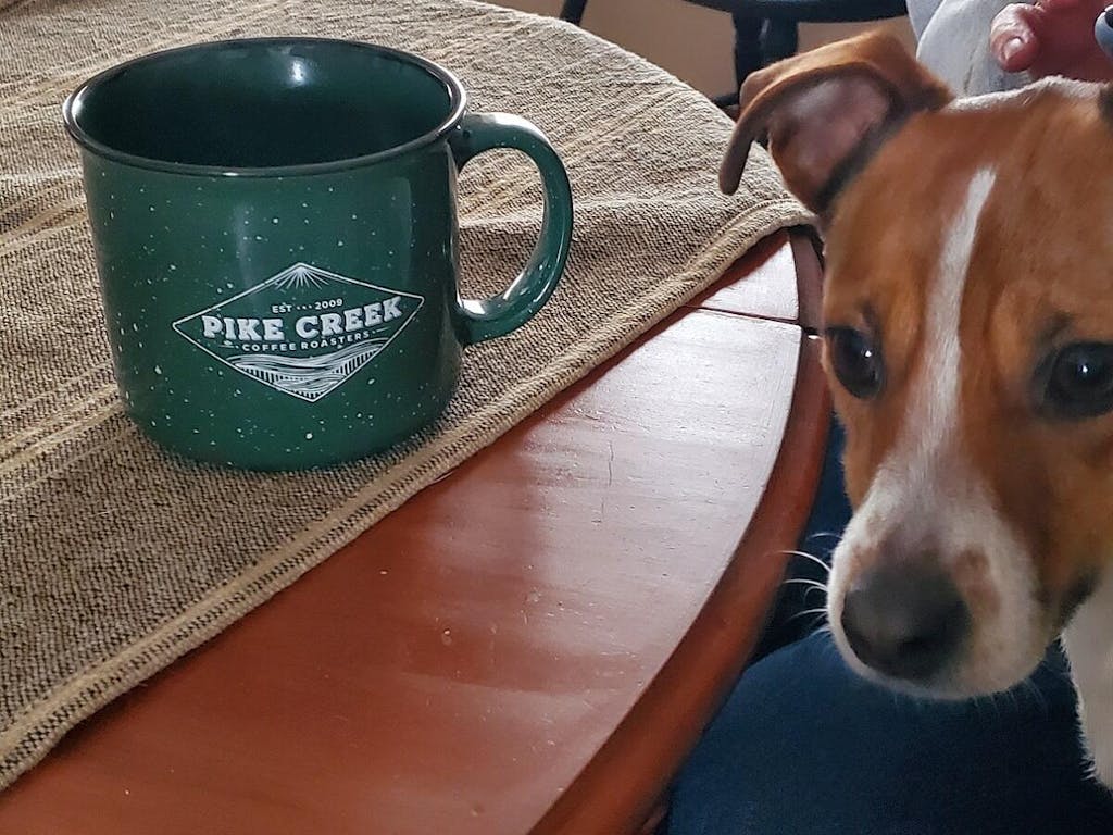 Coffee expert Mac, the Jack Russell, says, "Maybe I'm crazy, but I think this mug makes my Pike Creek Morning Fog taste even better!"